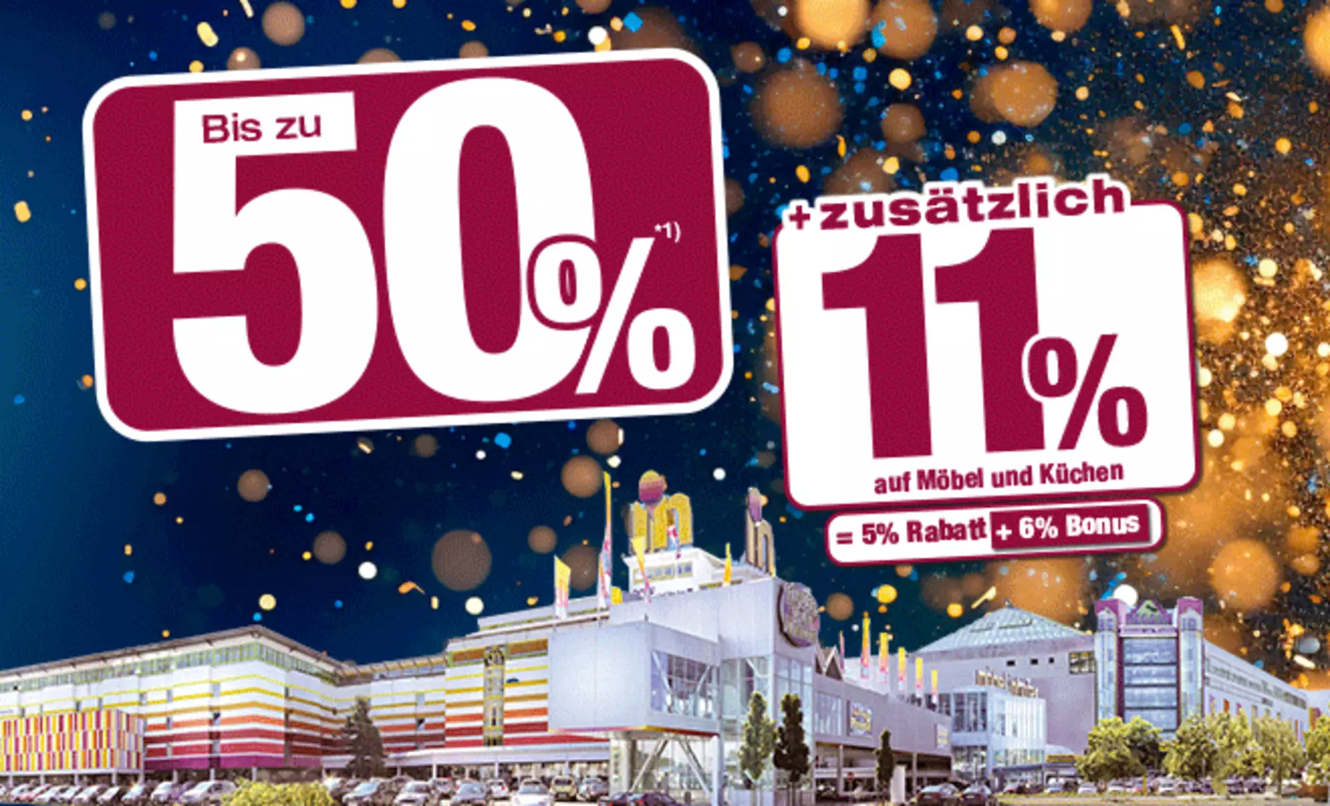 *3) 11% Preisvorteil. Gestaffelt mit 5% Sofortabzug auf alle Möbel und Küchen plus 6% Bonus für Besitzer der kostenlose Premium Card. Der Bonus wird nach Zahlung und Auslieferung automatisch dem Kundenkonto gutgeschrieben. Die kostenlose Premium Card kann auf Wunsch bei Auftragserteilung dazu beantragt werden. Der Sofortrabatt wurde an den Prospektartikeln bereits abgezogen.*1, 2, 3) Aktionen gültig nur für Neuaufträge bis 05.01.26. Inklusive Anzahlungsskonto. Ausgenommen Dienst- und Serviceleistungen. Die Aktionen werden bei Erfolg ggfls. verlängert.