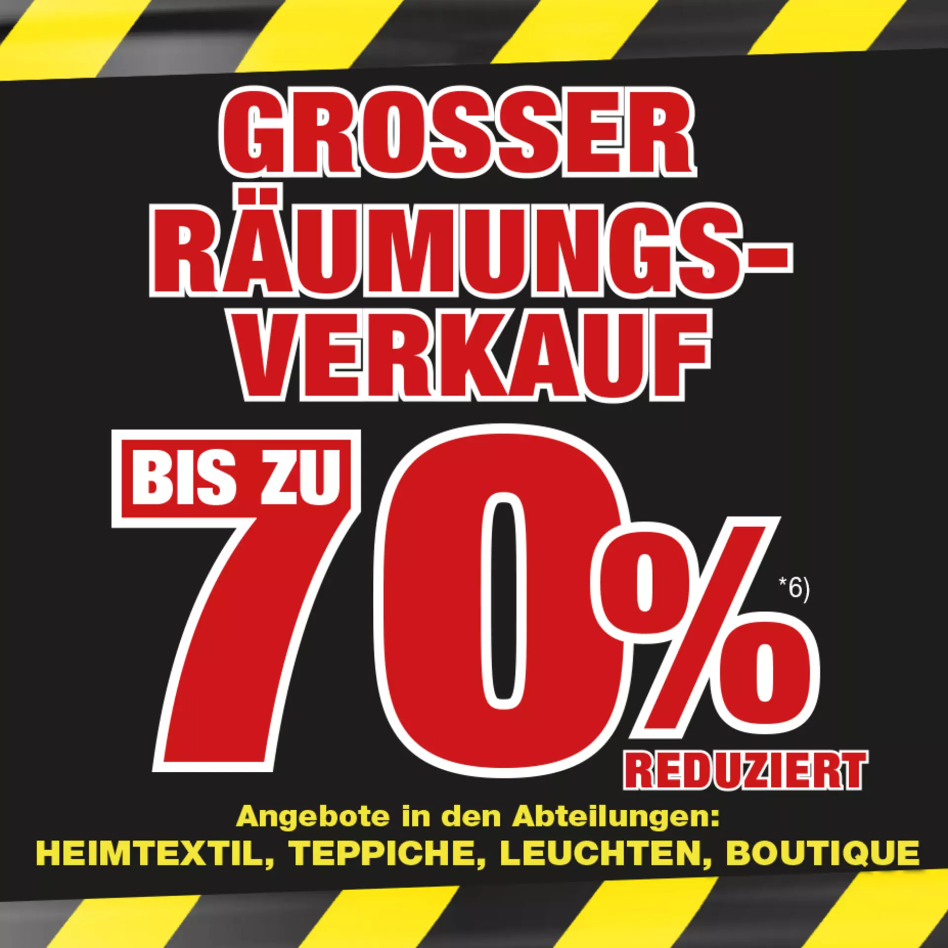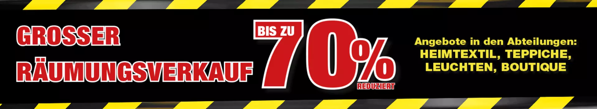 Nutzen Sie unseren großen Räumugsverkauf und entdecken Sie jetzt Ihre Lieblingstücke zu echten Knallerpreisen. Erhalten Sie bis zu 70 % Rabatt auf ausgewählte Artikel aus unserem Fachsortiment. Freuen Sie sich auf auf stark reduzierte Artikel aus den Bereichen Heimtextilien, Teppiche, Leuchten und Boutique-Ware.