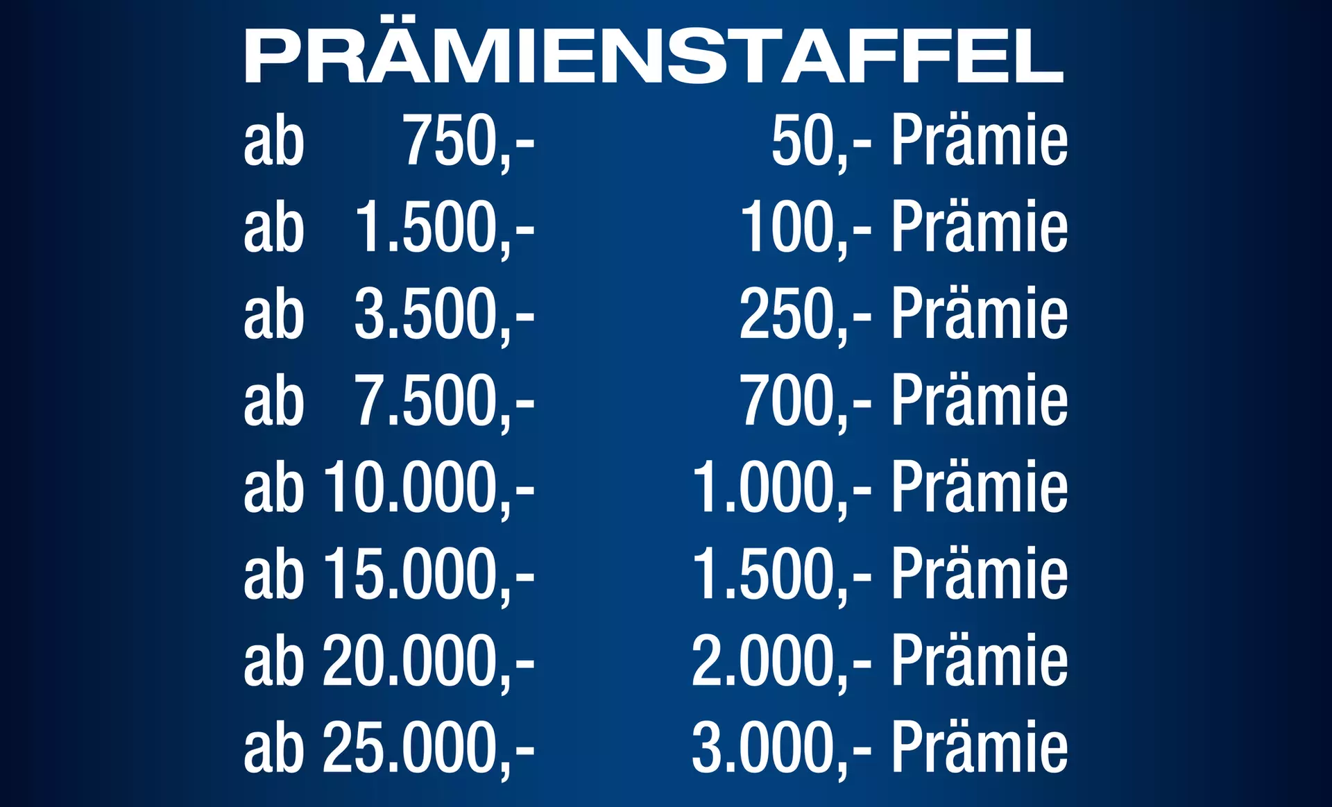 Zusätzlich profitieren Sie von einer Prämie von bis zu 3.000 € bei Ihrem Einkauf. Die Höhe der Prämie richtet sich nach dem jeweiligen Einkaufswert und kann der entsprechenden Prämienstaffel entnommen werden.