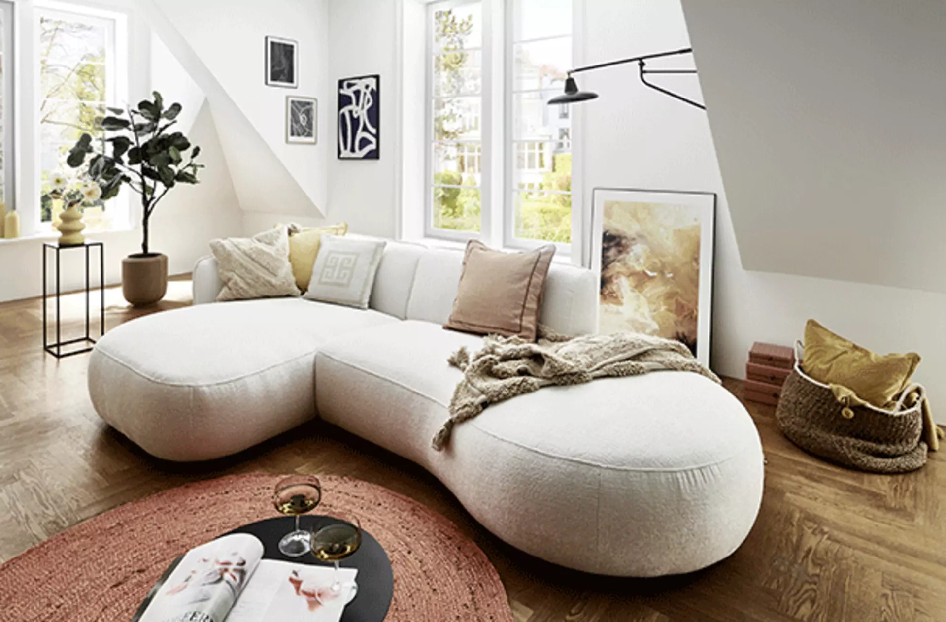 Das Herzstück dieses Looks ist das geschwungene Sofa, dessen voluminöse Formen den angesagten Chubby Chic perfekt verkörpern. Der hochwertige Bezug lädt zum Verweilen ein und bildet die ideale Basis für ein Spiel aus verschiedenen Texturen. Ergänzt wird das Arrangement durch Kissen in sanften Pastelltönen und eine grob strukturierte Kuscheldecke, die für zusätzliche Tiefe und Wärme sorgen.