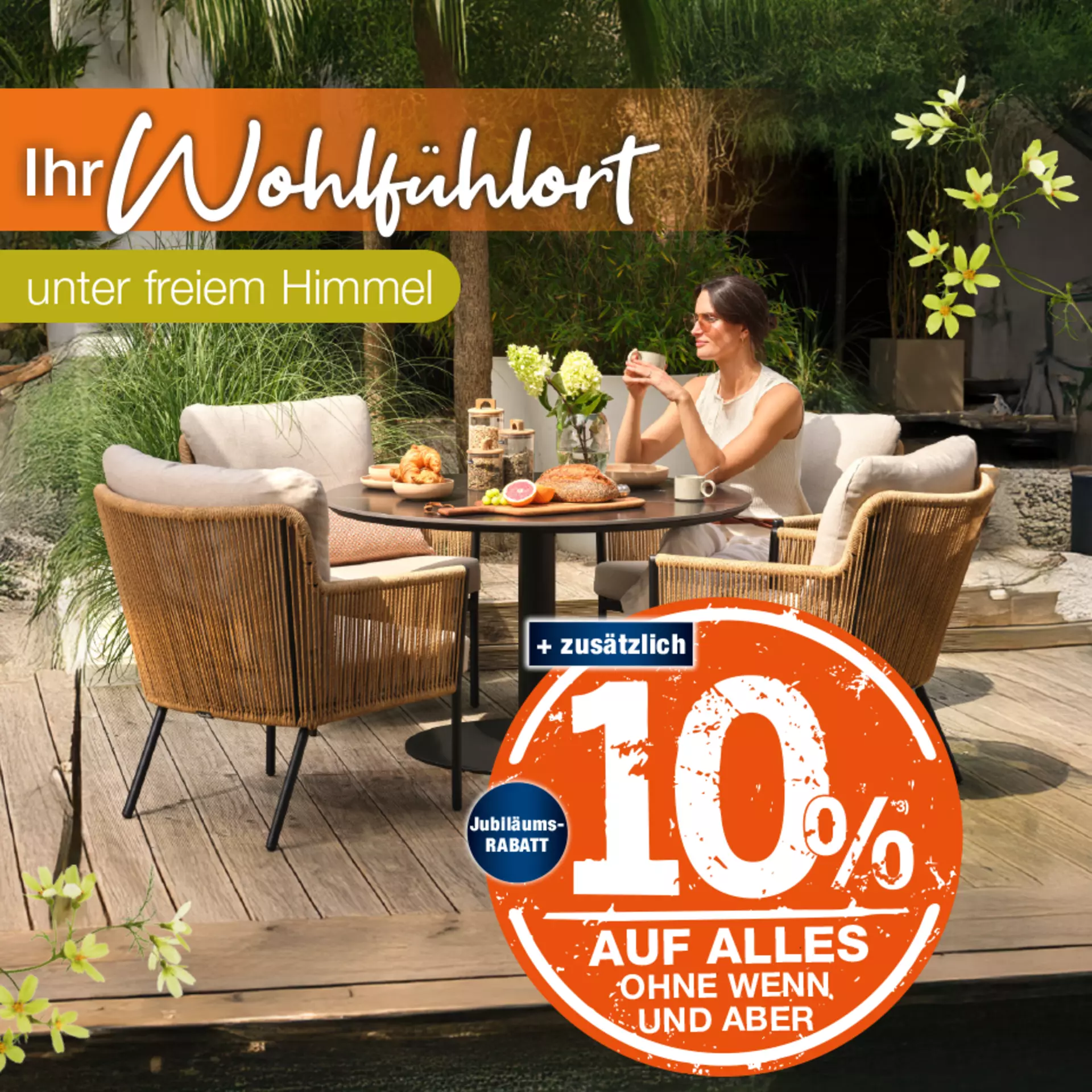 *3) 10% Jubiläumsrabatt auf Alles. Gültig auch auf alle Werbepreise, Markenrabatte und reduzierte Ausstellungsstücke. Ausgenommen Tankstelle, Restaurants, Dienst-& Serviceleistungen und Interni.