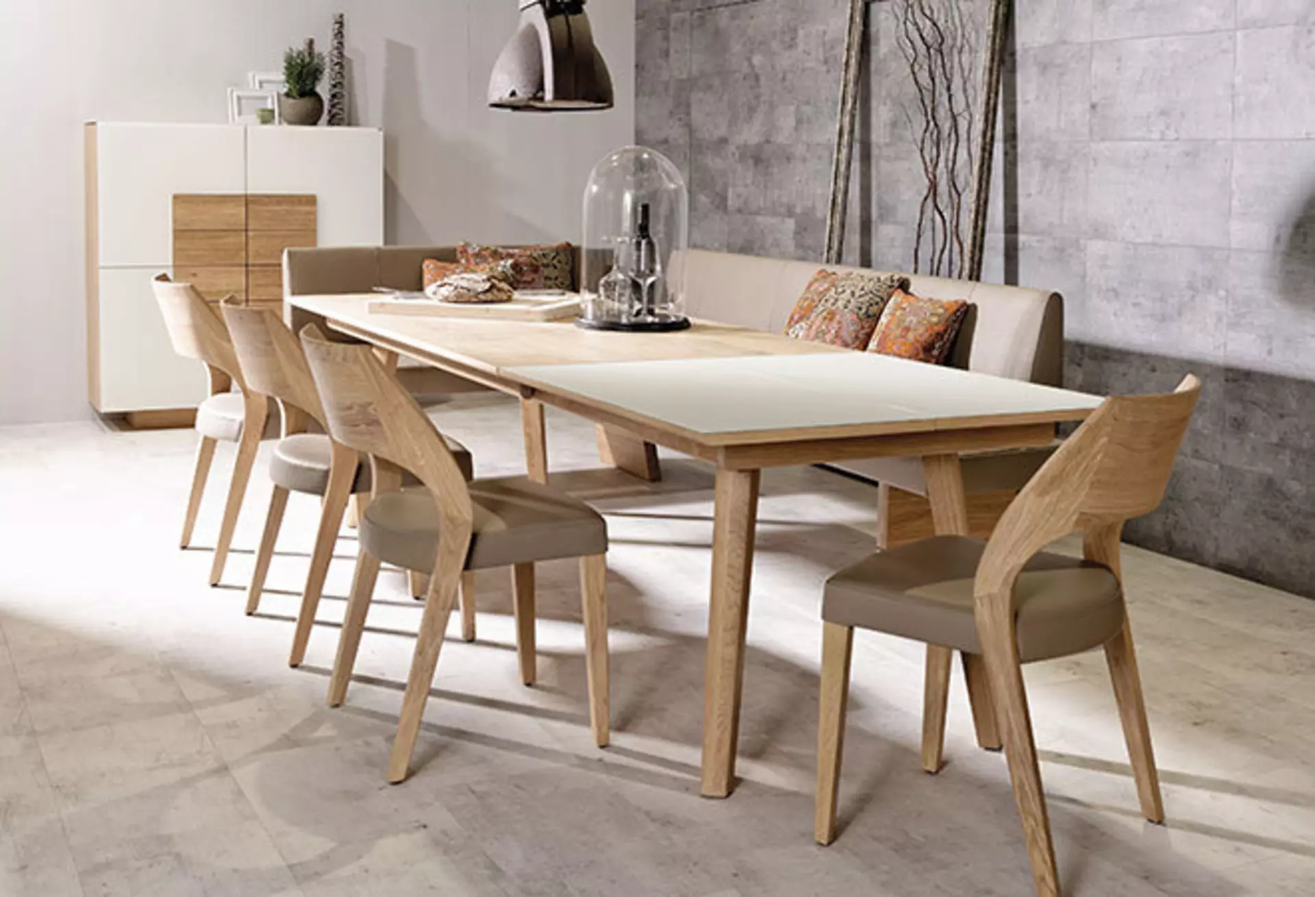 Tipp: Stimmen Sie die Materialien aufeinander ab — ein Holztisch harmoniert perfekt mit Stoffstühlen, während ein Glastisch moderne Schalenstühle betont.