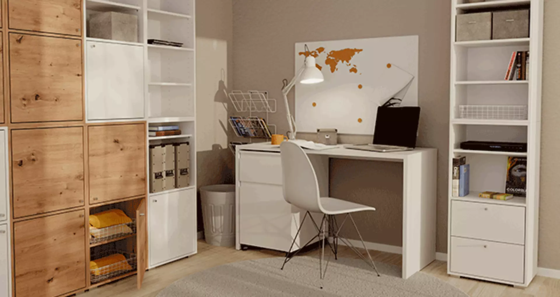 - Reduzieren Sie Möbel auf das Wesentliche: Schreibtisch, Stuhl,Stauraum.