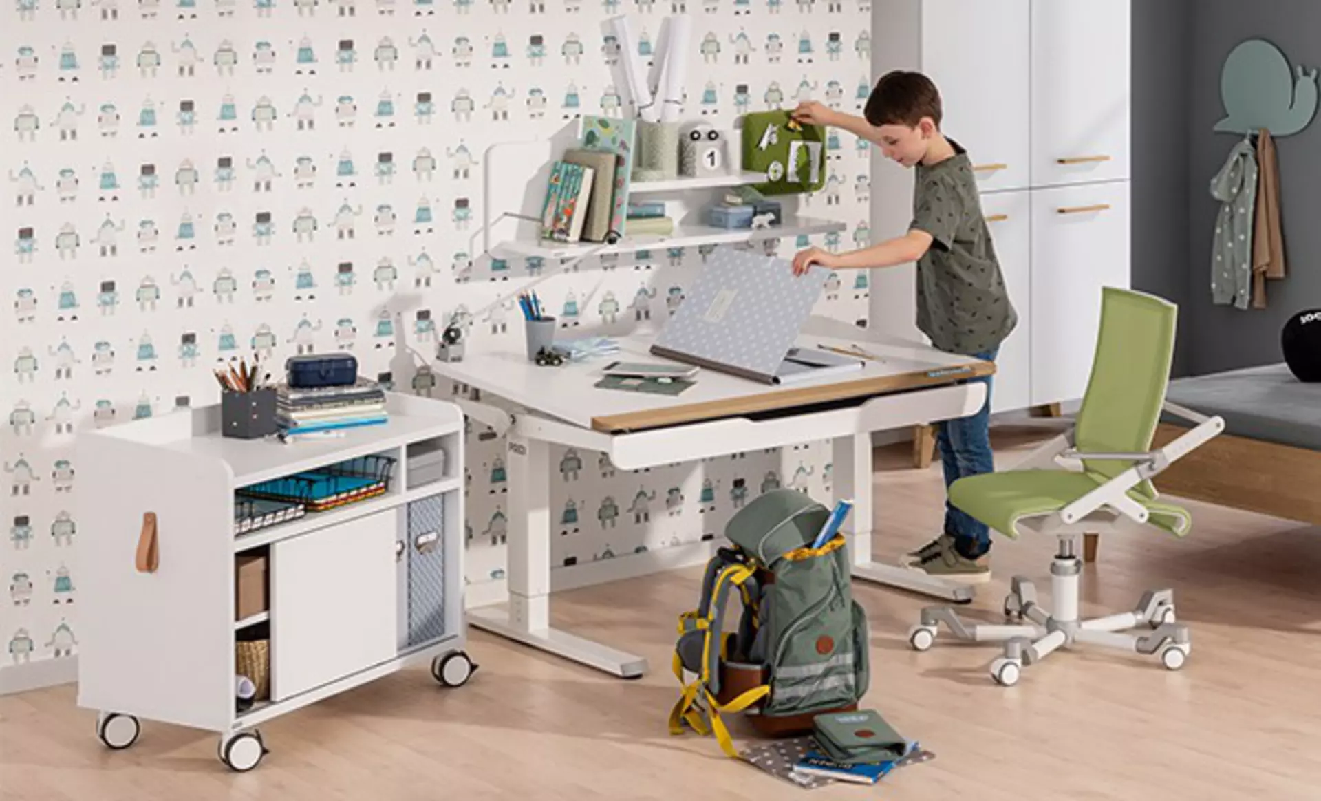 Ein ergonomischer Arbeitsplatz wird jetzt besonders wichtig. Ein gut gestalteter Schreibtisch schafft die Grundlage für konzentriertes lernen. Idealerweise ist es ein höhenverstellbarer Schreibtisch, sodass er sich über mehrere Jahre hinweg an die Körpergröße des Kindes anpassen lässt.