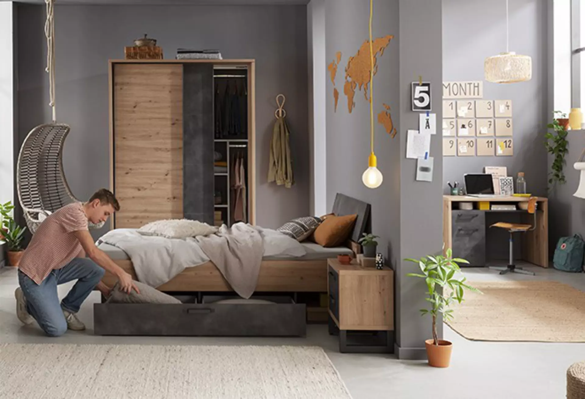 Jetzt rücken Möbel in den Vordergrund, die mehr Komfort und Individualität bieten. Ein größeres Bett sorgt für ausreichend Platz zum Entspannen, während ein moderner Schreibtisch weiterhin als Arbeitsplatz dient. Ein geräumiger Kleiderschrank wird ebenfalls wichtiger, da Kleidung und persönliche Gegenstände zunehmend mehr Platz benötigen.