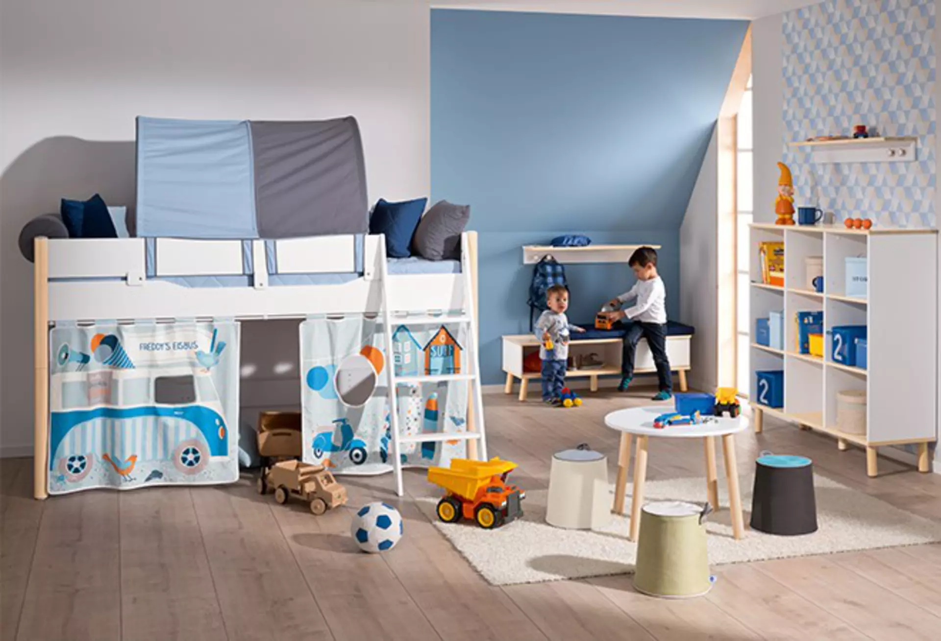 Eine klare Aufteilung des Zimmers kann ebenfalls sinnvoll sein. Wenn Bereiche für Spielen, Lernen und Schlafen voneinander getrennt sind, entsteht eine ruhige und strukturierte Atmosphäre.